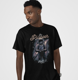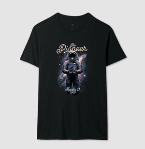 Celebre o espírito pioneiro da humanidade com esta estampa inspirada na missão Apollo 11 (1969) — o primeiro passo do homem na Lua. A arte retrata um astronauta cercado pelo cosmos, segurando simbolicamente um satélite, em uma homenagem ao feito que marcou o início da exploração espacial. Uma peça que combina design retrô e inspiração cósmica, perfeita para quem admira conquistas que mudaram a história. // Camiseta com modelagem regular em tecido premium 100% algodão e estampa em Silk HD. //