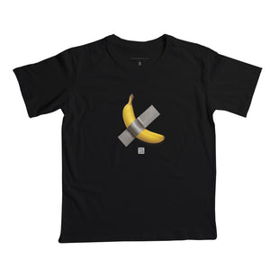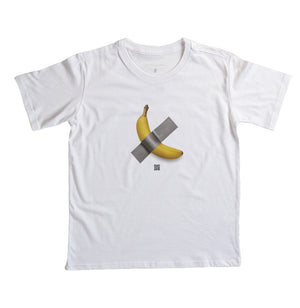 Inspirada na obra Comedian, do artista italiano Maurizio Cattelan. O objetivo do artista ao criar a obra foi criticar o conceito de arte e provocar pensamentos sobre o assunto. // Camiseta infantil confeccionada em tecido premium 100% algodão e estampa em Silk HD. \\ moda genderless.