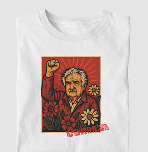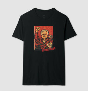 Durante a Rio+20 - Conferência das Nações Unidas sobre Desenvolvimento Sustentável - realizada Rio de Janeiro em 2012, o então presidente do Uruguai José Pepe Mujica fez um de seus discursos mais memoráveis de sua trajetória política. Ele encerrou seus discurso falando "Essas coisas que digo são muito simples: o desenvolvimento não pode ser contra a felicidade. Tem que ser a favor da felicidade humana: do amor pela vida, das relações humanas, do cuidado com os filhos, de ter amigos, de ter o essencial." // Camiseta com modelagem regular confeccionada em tecido premium 100% algodão e estampa em Silk HD. \\