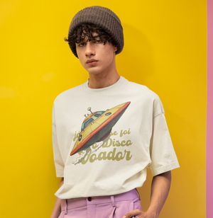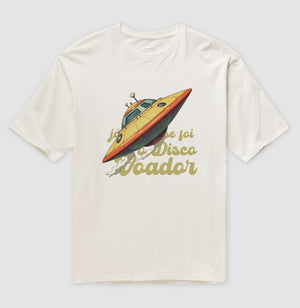 Os episódios do Chaves começaram a ser exibidos na década de 80 no Brasil, através do SBT. Em um dos icônicos episódios, Chaves e Quico estavam brincando com um disco voador, quando o Seu Madruga cria uma estratégia brilhante para não encontrar o Seu Barriga e ter de pagar os 14 meses de aluguel: quando as crianças avistassem o senhor Barriga deveriam gritar "Já chegou o disco voador!", assim o seu Madruga saberia que ele estava na vila e poderia se esconder a tempo. Quando o senhor Barriga fosse embora as crianças deveriam gritar "Já se foi o disco voador!". É claro que o plano não deu certo, mas essas frases marcaram uma geração inteira, e agora fazem parte da nossa coleção "Nostalgia". // Camiseta com modelagem oversized, em tecido premium 100% algodão, gola canelada e estampa em Silk HD. \\ moda genderless.
