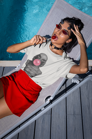 Entre as décadas de 1950 e 1980 mascar chiclete era um ato de rebeldia, por isso diversos personagens "bad ass" eram retratados naquela época mascando chiclete. Nesta coleção apresentados os icônicos personagens Monstros da Universal mascando a famosa goma de tutti frutti. // Camiseta com modelagem oversized, em tecido premium 100% algodão, gola canelada e estampa em Silk HD. \\ moda genderless.