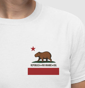 Uma releitura gaudéria da bandeira da California, muito utilizada na moda Street Wear, substituindo o urso por uma Capivara. // Camiseta com modelagem regular em tecido premium 100% algodão e estampa em Silk HD. \\